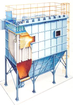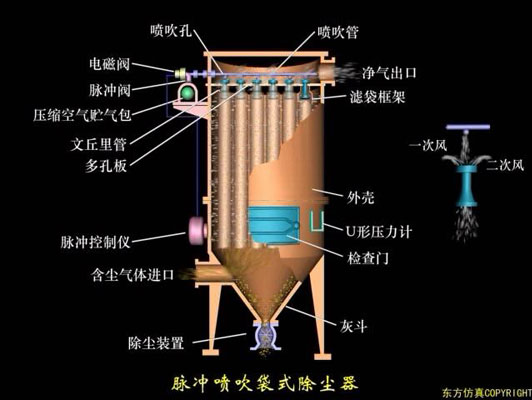 脈沖布袋除塵器工作時,含塵氣體由進風道進入灰斗,粗塵粒直接落入灰斗底部,細塵粒隨氣流轉折向上進入中、下箱體,粉塵積附在濾袋外表面,過濾后的氣體進入上箱體至凈氣集合管-排風道,經排風機排至大氣。 清灰過程是先切斷該室的凈氣出口風道,使該室的布袋處于無氣流通過的狀態(tài)(分室停風清灰)。然后開啟脈沖閥用壓縮空氣進行脈沖噴吹清灰,切斷閥關閉時間足以保證在噴吹后從濾袋上剝離的粉塵沉降至灰斗,避免了粉塵在脫離濾袋表面后又隨氣流附集到相鄰濾袋表面的現象。