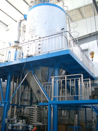 空氣經(jīng)過濾和加熱,進入干燥器頂部空氣分配器,熱空氣呈螺旋狀均勻地進入干燥室。料液經(jīng)塔體頂部的高速離心霧化器,(旋轉(zhuǎn))噴霧成極細微的霧狀液珠,與熱空氣并流接觸在極短的時間內(nèi)可干燥為成品。成品連續(xù)地由干燥塔底部和旋風(fēng)分離器中輸出,廢氣由風(fēng)機排空。