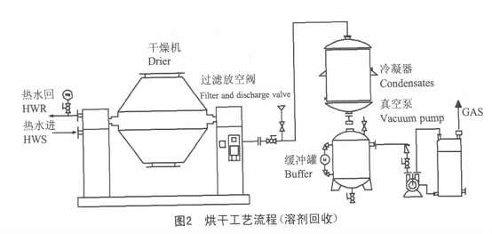 (2)蒸汽或熱水加熱,需要溶劑回收工藝流程,與不需要回收溶劑工藝流程相比,添加了冷凝器及相應的溶劑回收裝置,如圖2