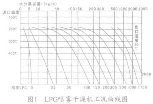 范圍以內(nèi)。小于 50μm的液滴, 雖以 100~150m/s 的相對速度運動, 該值也不超過 200。當液滴速度很快地衰減到與氣流速度相等時, 液滴便在Stokes 所描述的范圍內(nèi)運動, 該值小于 2。因此, 以邊界層理論為基礎(chǔ)的、 在靜止空氣中的液滴蒸發(fā)理論, 可用于噴霧干燥條件中。據(jù)資料介紹,液滴直徑為500μm時,在 300℃的熱風(fēng)中完全干燥時間約需 4.6s;而直徑 100μm、熱風(fēng)溫度為150℃以上時,其完全干燥時間在1s 以內(nèi)。高嶺土液滴中含有溶質(zhì),在干燥過程中情況比較復(fù)雜。在等速階段,液滴中的內(nèi)部水分能迅速擴散到液滴表面蒸發(fā)汽化。當液滴表面轉(zhuǎn)化為固體時,蒸發(fā)速度減慢,干燥進入減速階段。在液滴表面形成一層硬化的表層外殼后,殘留在內(nèi)部的水分將產(chǎn)生一定的氣壓,當氣壓增大造成表層外殼爆裂形成穿孔時,產(chǎn)品呈多孔性疏松狀態(tài)。因此,該過程要比純液滴蒸發(fā)干燥時間長得多,約為10~15s。從上分析可知,含有可溶性溶質(zhì)的高嶺土液滴干燥的時間,等于等速和減速兩個階段干燥時間的總和,主要與初始液滴直徑和臨界濕含量有關(guān)。由于高嶺土料漿中有溶解鹽的存在而引起蒸氣壓的降低程度,將隨每個液滴大小而不同,固相的生成也因液滴大小而有先后,因而水分傳遞的阻力也隨之而有區(qū)別。在料漿噴霧干燥過程中,由于原漿濃度的差異,其特性也各不相同。LPG 噴霧干燥機利用高效先進的霧化器技術(shù)和布風(fēng)技術(shù),自動進行調(diào)整,以適應(yīng)不同濃度的料漿。各種型號 LPG 噴霧干燥機的工況曲線圖,見圖 1。