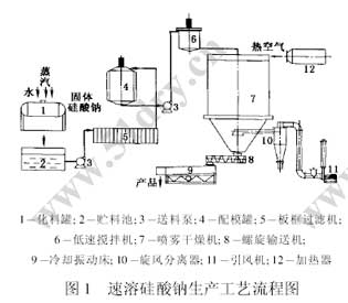 硅酸鈉用途非常廣泛,目前市場上的硅酸鈉產(chǎn)品多為固體或液體。液體硅酸鈉在包裝、運(yùn)輸及貯存等各個環(huán)節(jié)都存在一些問題;固體硅酸鈉的溶解是一個非常復(fù)雜及漫長的過程,需將固體碎粒放入滾筒化料機(jī)中,用蒸汽逐步溶解,整個過程包括水合、初步溶解、水解和膠溶等復(fù)雜的物理化學(xué)過程。而且溶解固粒硅酸鈉需用4-5h,溶解的水溶液需經(jīng)沉淀或過濾除去未熔化的石英砂等雜質(zhì)制成產(chǎn)品。這些因素對硅酸鈉產(chǎn)品的使用造成了許多不便,限制了工業(yè)化的應(yīng)用,因此新型硅酸鈉產(chǎn)品的研究迫在眉睫。