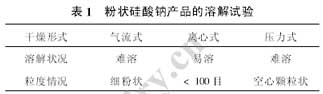 筆者分別應(yīng)用此3種形式的噴霧干燥設(shè)備干燥液體硅酸鈉,由于速溶硅酸鈉的主要技術(shù)指標(biāo)是溶解速度,所以對干燥后的粉狀硅酸鈉產(chǎn)品的溶解性進(jìn)行了溶解試驗(yàn),試驗(yàn)結(jié)果見表1。
