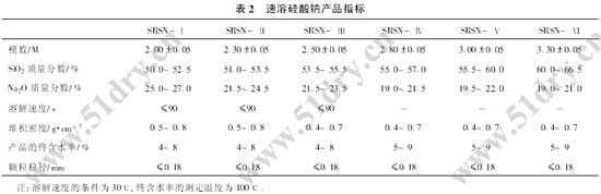 速溶硅酸鈉的溶解速度是用戶非常關(guān)心的問題,在研制生產(chǎn)過程中發(fā)現(xiàn),速溶硅酸鈉的溶解速度不僅與物料的模數(shù)有關(guān),還與干燥后產(chǎn)品的終水含率有密切關(guān)系,在生產(chǎn)過程中應(yīng)嚴(yán)格控制干燥溫度,以達(dá)到合格的終含水率。速溶硅酸鈉的具體指標(biāo)見表2。