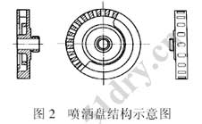 霧化器是噴霧干燥的核心部件,它的性能好壞對噴霧干燥起決定性作用。試驗(yàn)初期選用了機(jī)械齒輪霧化器,連續(xù)運(yùn)行了10天后,粘壁現(xiàn)象已十分嚴(yán)重,無法繼續(xù)生產(chǎn),后來改用高速電動霧化器,情況得到緩解,生產(chǎn)一段時間后又出現(xiàn)干燥塔內(nèi)壁一側(cè)粘壁,而另一側(cè)未粘壁的現(xiàn)象,筆者分析研究后發(fā)現(xiàn)霧化器的料液噴灑盤結(jié)構(gòu)不完善,料液從一側(cè)進(jìn)入霧化器,尚未均勻分配就已在高速離心力的驅(qū)動下被甩出霧化器,料液分布不均,從而造成干燥塔一側(cè)粘壁,筆者將噴灑盤的結(jié)構(gòu)略加更改后解決了這一問題,更改后的噴灑盤結(jié)構(gòu)示意見圖2。