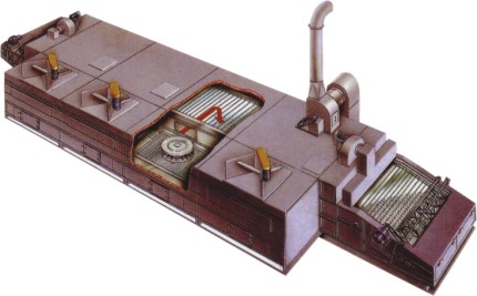 | 將要干燥的物料通過適當(dāng)?shù)募恿蠙C構(gòu),均勻分布在網(wǎng)帶上,干燥時,從網(wǎng)帶和物料的上方和下方強制輸入熱風(fēng),使被干燥的每個粒子表面都成為受熱面,增大物料與熱風(fēng)的接觸面積顯著增加導(dǎo)熱面積,使物料內(nèi)部水分?jǐn)U散距離縮短。因此,能夠進(jìn)行效果極好的干燥操作,特別是對于被干燥物料在增加適當(dāng)?shù)念A(yù)備成型后再進(jìn)行干燥。因此,選用該系列干燥機具有較高的穩(wěn)定性和高節(jié)能的優(yōu)點。 特點 可設(shè)定適宜的操作條件,根據(jù)通風(fēng)方式相應(yīng)的干燥狀態(tài),可任意調(diào)節(jié)溫度,風(fēng)量等操作條件。 自由調(diào)節(jié)加工后水分,由于可以自由調(diào)節(jié)干燥裝置內(nèi)的材料停流量,停留時間,因此可任意設(shè)定加工后產(chǎn)品的含水量。 很少破壞形狀和灰塵,物料在干燥裝置內(nèi),是靜止?fàn)顟B(tài)移動的,可幾乎不破壞產(chǎn)品的形狀,也無灰塵飛散。 可使用各種傳送帶,根據(jù)干燥物料的不同,傳送帶除各種金屬絲網(wǎng)之外,也可用震動板。 傳送帶可清洗,加熱室與干燥室分開,更便于清洗傳送網(wǎng)帶。 根據(jù)要求,可在設(shè)備底板裝配清掃裝置,將少量掉于底板上的物料刮送到出料端。 根據(jù)產(chǎn)量物料水分不同,可選擇多臺設(shè)備串聯(lián)使用,以提高產(chǎn)量。 |